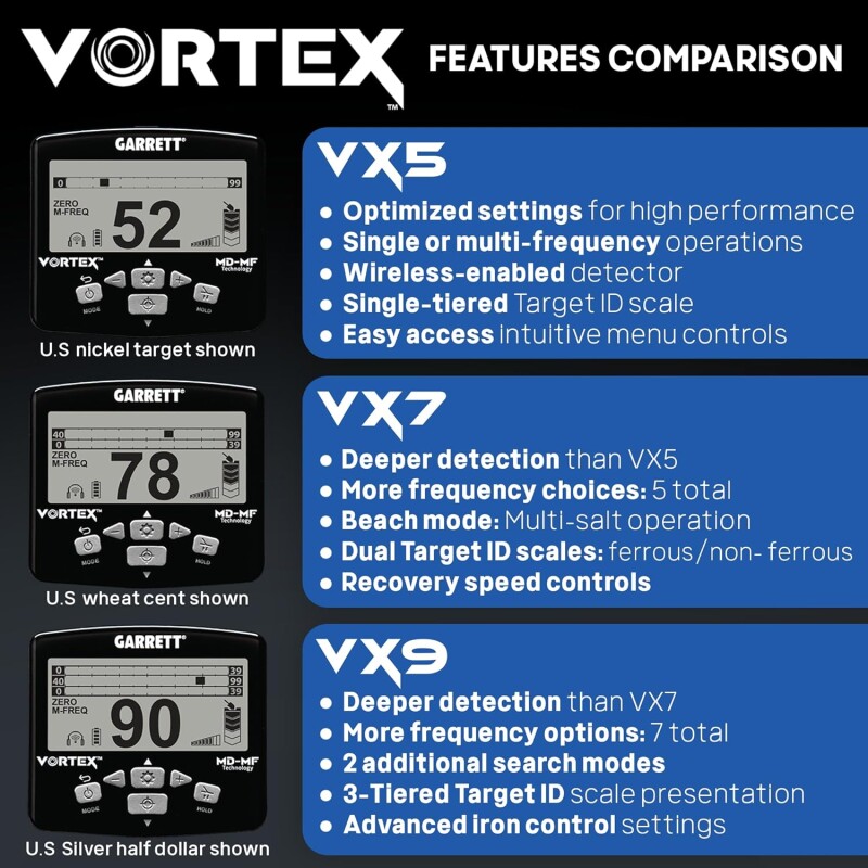 Garrett Vortex VX7 — это многофункциональный металлоискатель, созданный для профессионального поиска, который предоставляет исключительный контроль и точность в самых сложных условиях. Он работает на основе технологии MD-MF и имеет несколько вариантов частот: две мощные одиночные частоты (5 кГц или 13 кГц) и две опции мульти-частотного режима, специально для использования на влажном песке и в соленой воде.